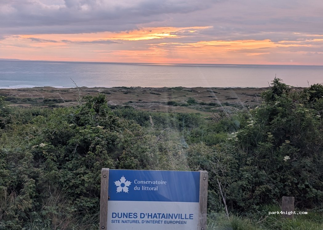 Parking le long de la route qui mène à la plage d'Hatainville, en contrebas d'un autre grand parking. Très légèrement en pente.