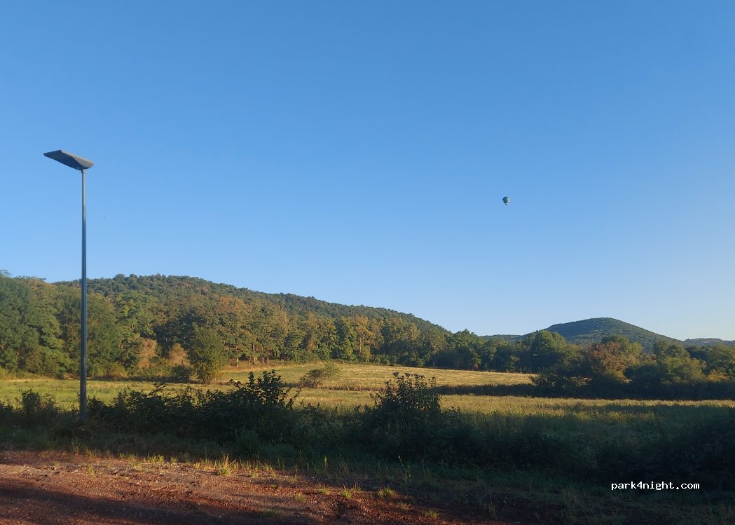 La partie haute du parking sert aux clients du restaurant voisin mais le bas après la barriere est plus plat . Nuit très calme et peu fréquenté , nous étions seuls pour un début août ! Décollage de mongolfieres au petit matin. Aucun service!