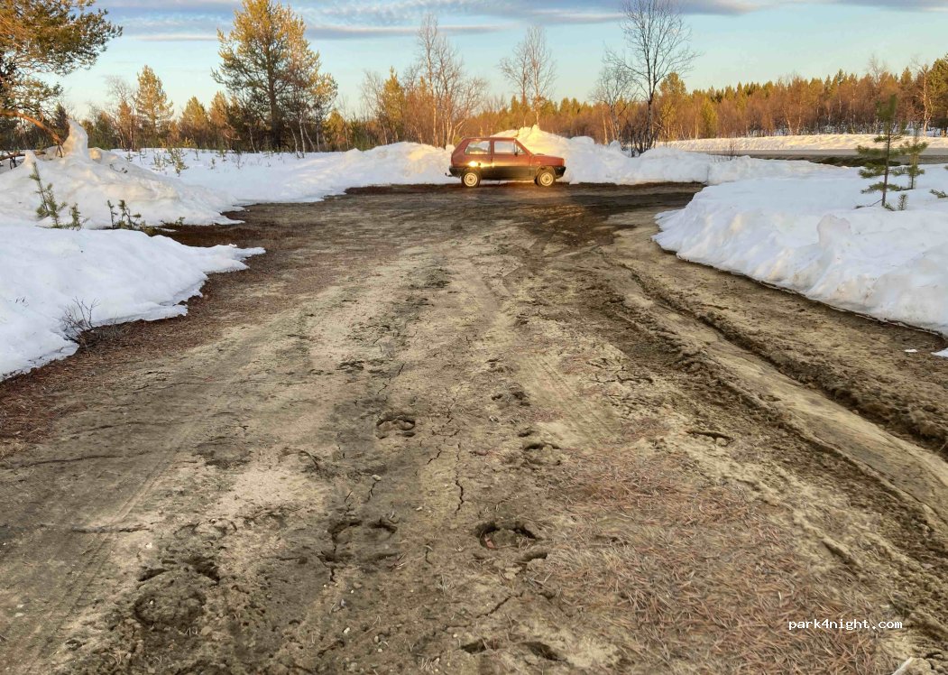 Het begin van een oprit naar wat houten huisjes. In de winter is het meertje niet bereikbaar. Maar het begin van de oprit is ruim zat zodat je niemand in de weg staat.
