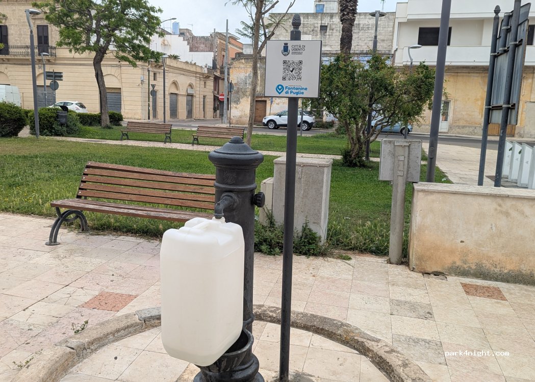 Punto di rifornimento idrico con parcheggio comodo per furgoni di medie dimensioni. Non è possibile allacciarsi con tubi flessibili, quindi è necessario utilizzare contenitori. La pressione non è molto alta, ma è fattibile.