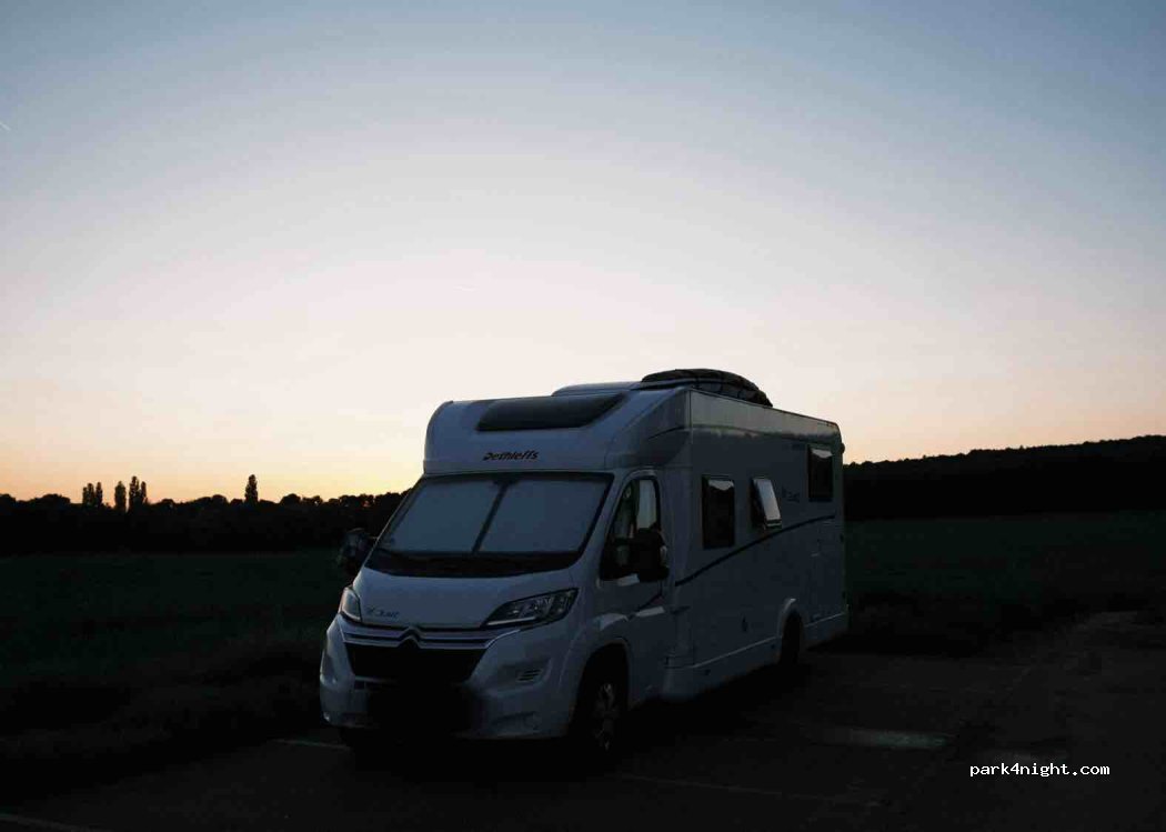 Einfacher Parkplatz mit Blick über die Felder. Platz für ein großes Womo (wir sind mit 7 Metern unterwegs und haben uns quer auf ein paar freie Parkplätze gestellt) oder mehrere Camper. Auf der anderen Seite ist ein Wohnblock - uns hat niemand wirklich beachtet und wir standen 2 halbe Tage und die Nacht dort. Solange man leise und unauffällig ist, scheinbar kein Problem - Müll bitte mitnehmen! Wanderweg geht direkt hinter dem Parkplatz los - super auch mit Hund! Sehr ruhig, nur eine Landstraße, die wenig befahren war. Recht gerader geteerter Platz. Morgens wurde der Parkplatz auch von Autos genutzt - abends war es komplett leer.