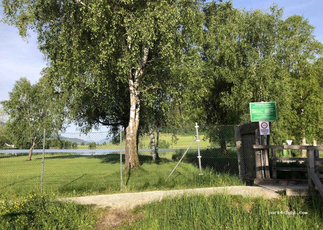 Parking lot at the lido at Putterersee. According to the sign, parking overnight is permitted only in summer. Public restrooms are located at the community center. Lake access is provided by a bench. Swimming is only permitted at the lido.