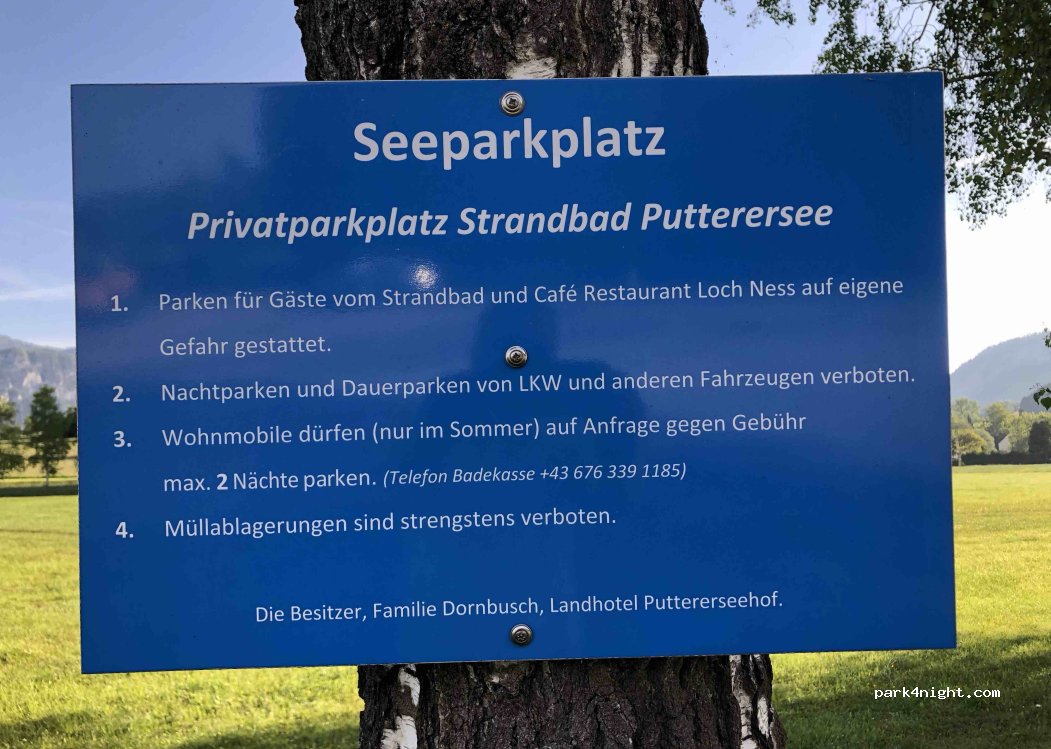 Parkplatz beim Strandbad am Putterersee. Laut Beschilderung ist das Parken über Nacht nur im Sommer gestattet. Öffentliche Toiletten befinden sich beim Gemeindehaus. Der Seezugang erfolgt über eine Bank. Schwimmen ist nur im Strandbad gestattet.