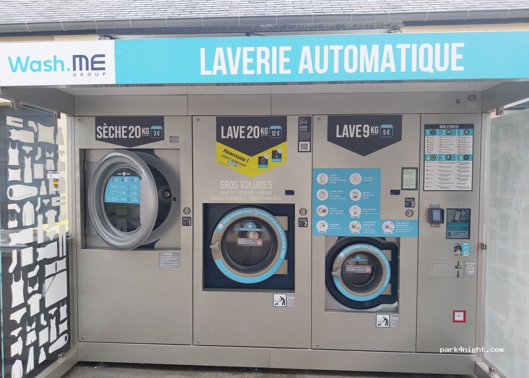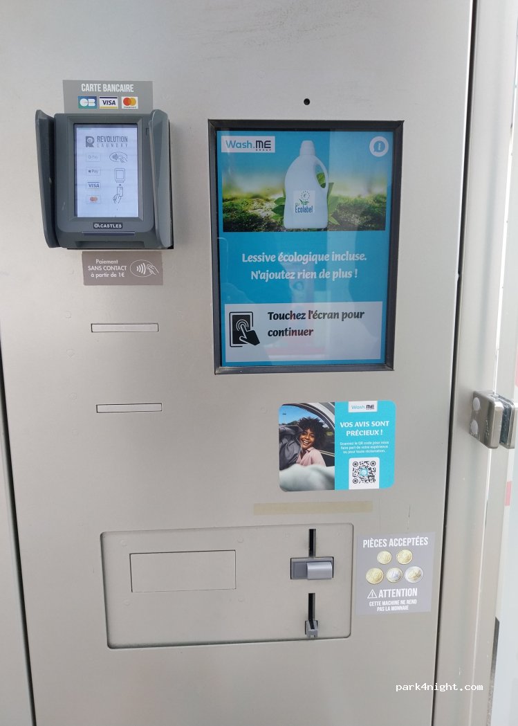 Laverie fonctionnelle. Payement en carte ou espèces (euros). Il y a une petite supérette à côté avec un gérant très sympathique. Une pharmacie est en face de la laverie.