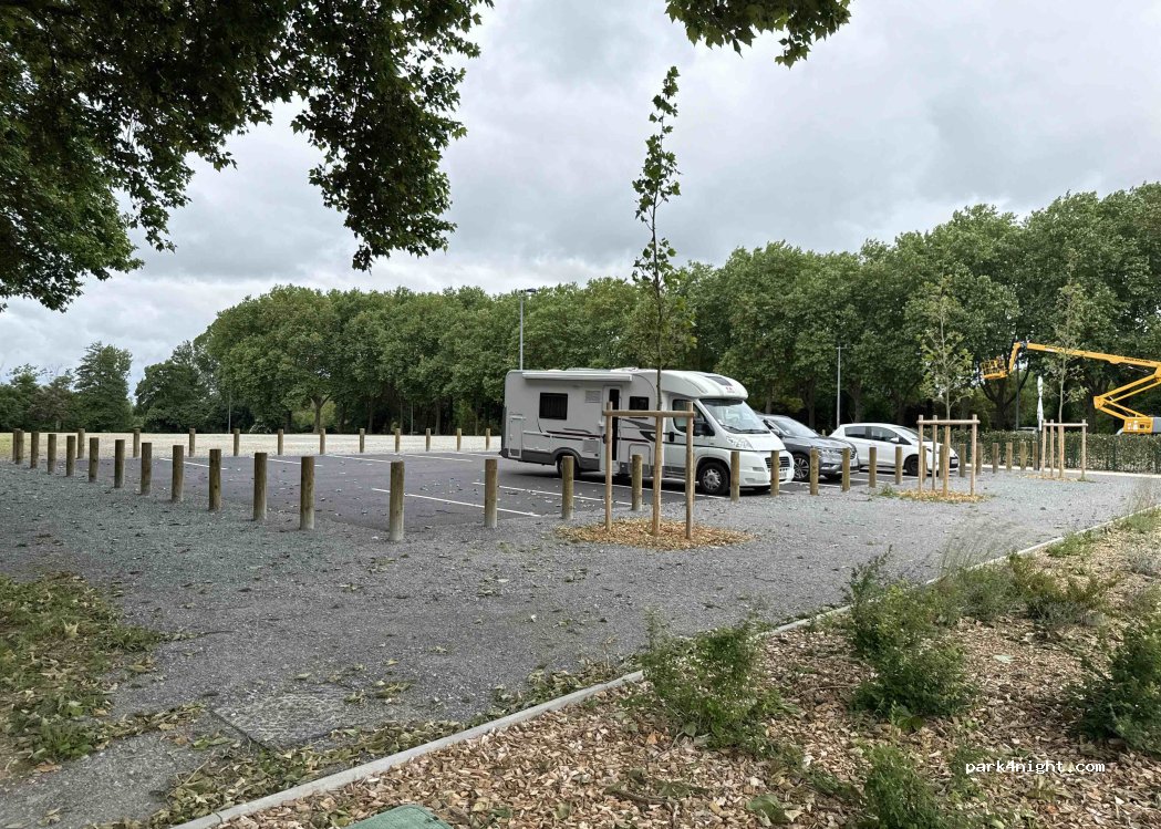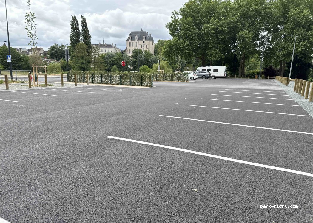 J'ai trouvé cet endroit en me promenant. Idéal pour visiter le centre, le château ou se promener le long de la rivière. Cela a l'air neuf, donc je ne sais pas s'ils peuvent y imposer des restrictions. Les parkings ne sont pas très grands pour les camping-cars longs. À ce jour, il n'y a aucun panneau interdisant les nuitées ou les limites de hauteur.