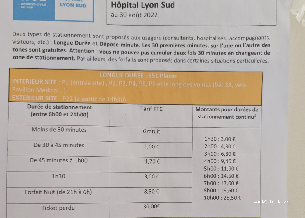 Parkplatz direkt am Hospital. Metro in Richtung Lyon ebenfalls in direkter Nähe.