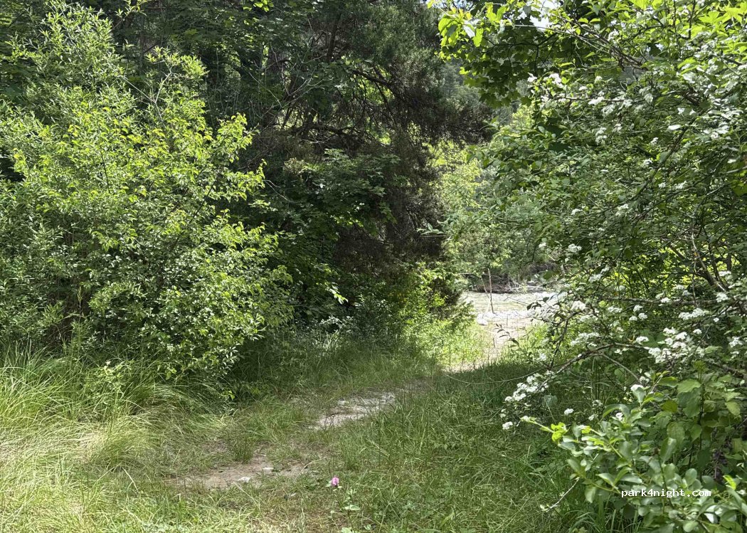 Coin solo bien protégé au bord de la rivière et entouré d’arbres. Par contre on entend la circulation bien pour une étape rapide