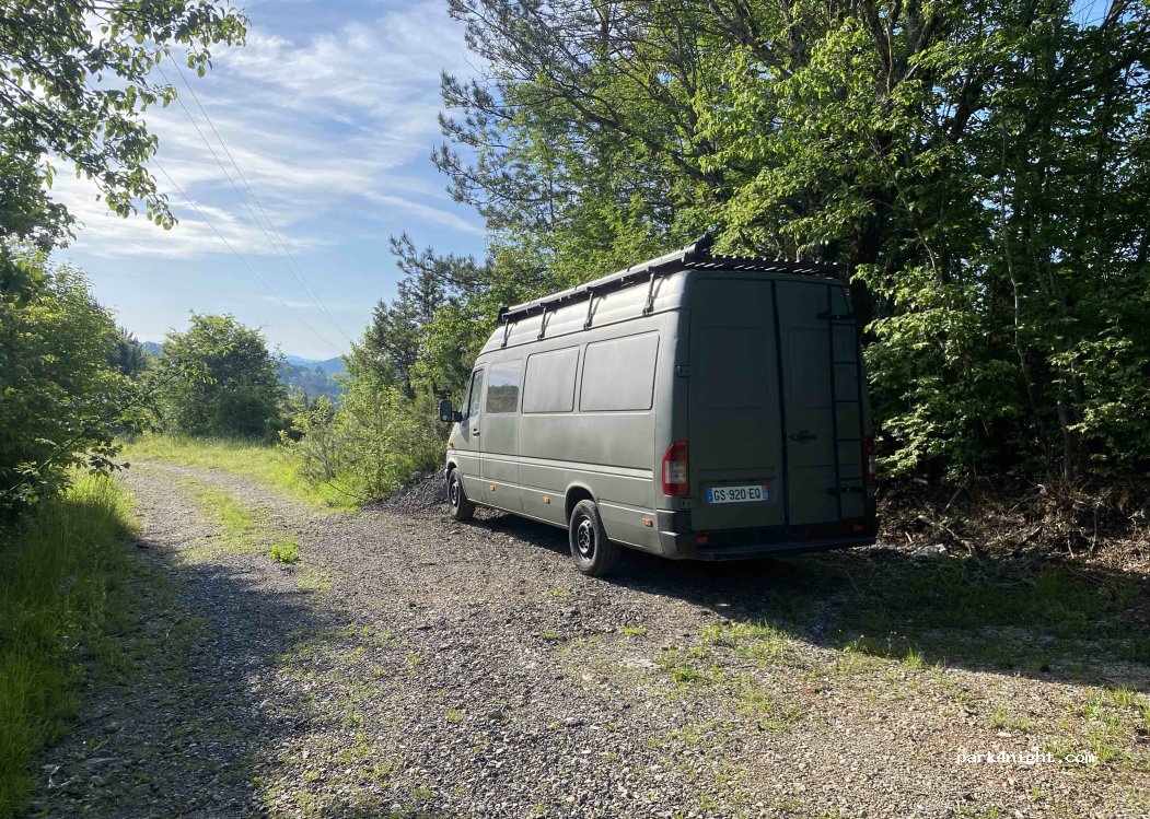 Emplacement situé à quelques dizaines de mètres de la route, caché par la végétation. Nuit calme, aucun passage direct, seulement le bruissement de la route en arrière plan. Rien de pittoresque, juste un emplacement safe pour une halte en chemin.