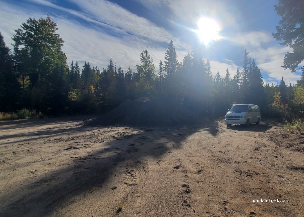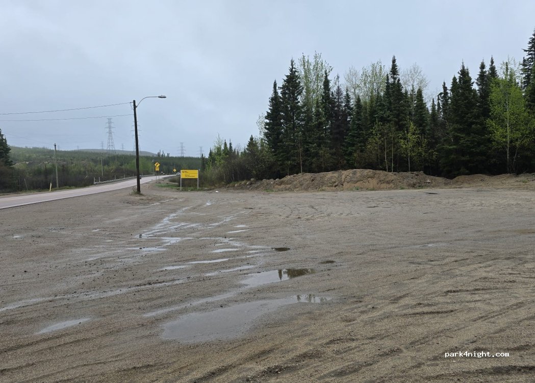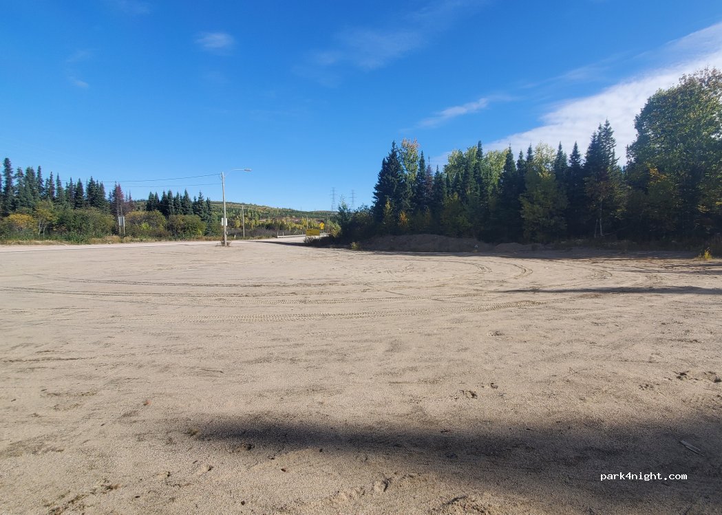 Terrain en terre battue (et même sablonneux) tranquille pour une nuit de repos après une visite au belvédère de Manic 5. Quelques camions s'arrêtent pour une pause méritée, mais l'emplacement reste agréable pour se reposer. (C'est un point de rassemblement d'Hydro-Québec en cas d'urgence, donc pourrait ne pas être utilisable pour les road tripeux dans ce cas-là).