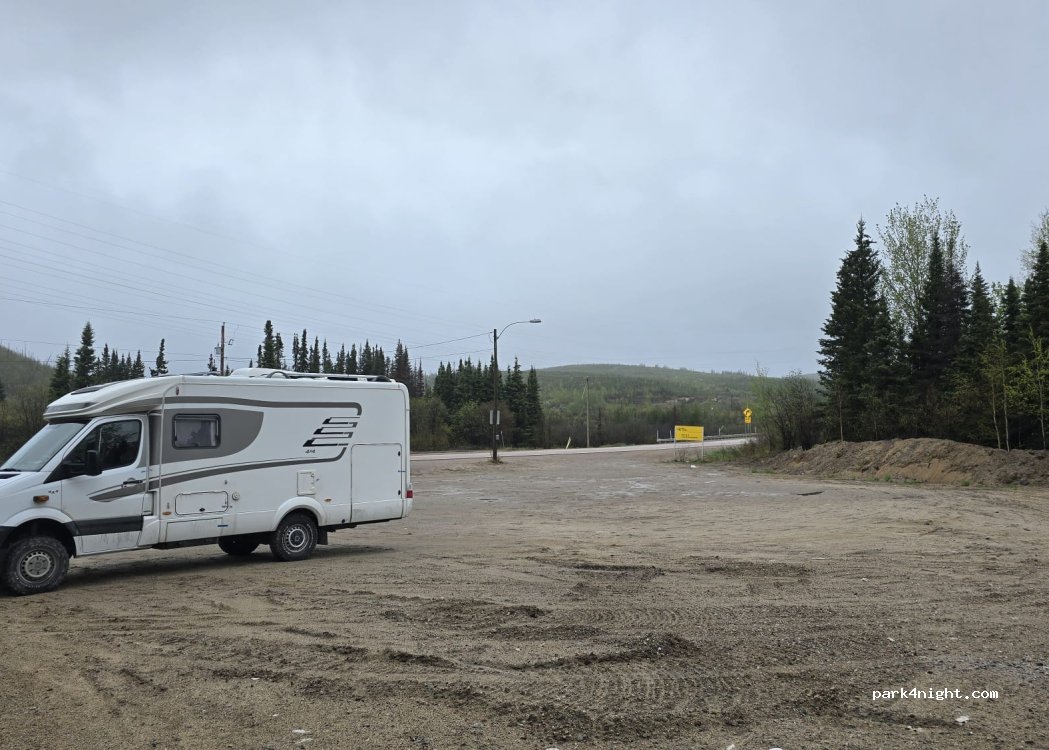 Hay un lugar libre para dormir después de la difícil carretera de tierra 389 hacia la central hidroeléctrica Manic 5. Hay una gasolinera con estacionamiento de pago cerca de la central, pero es bastante cara y el ambiente es bastante ruidoso.