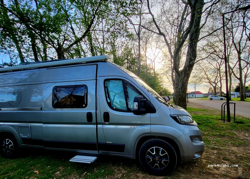 idéal pour aller au spectacle du château à l abri des platanes ,sol herbeux et à deux pas de l entrée pour le spectacle portail en fer rouge au bas de l allée. Pas de service. un bon spot au calme surtout quand l aire goudronné qui nous est réservé est pleine .l office du tourisme nous confirme que le stationnement est autorisé les soirs de spectacle.