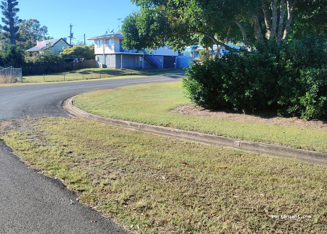 Uphill/downhill grassy spot next to the side road. No signs.