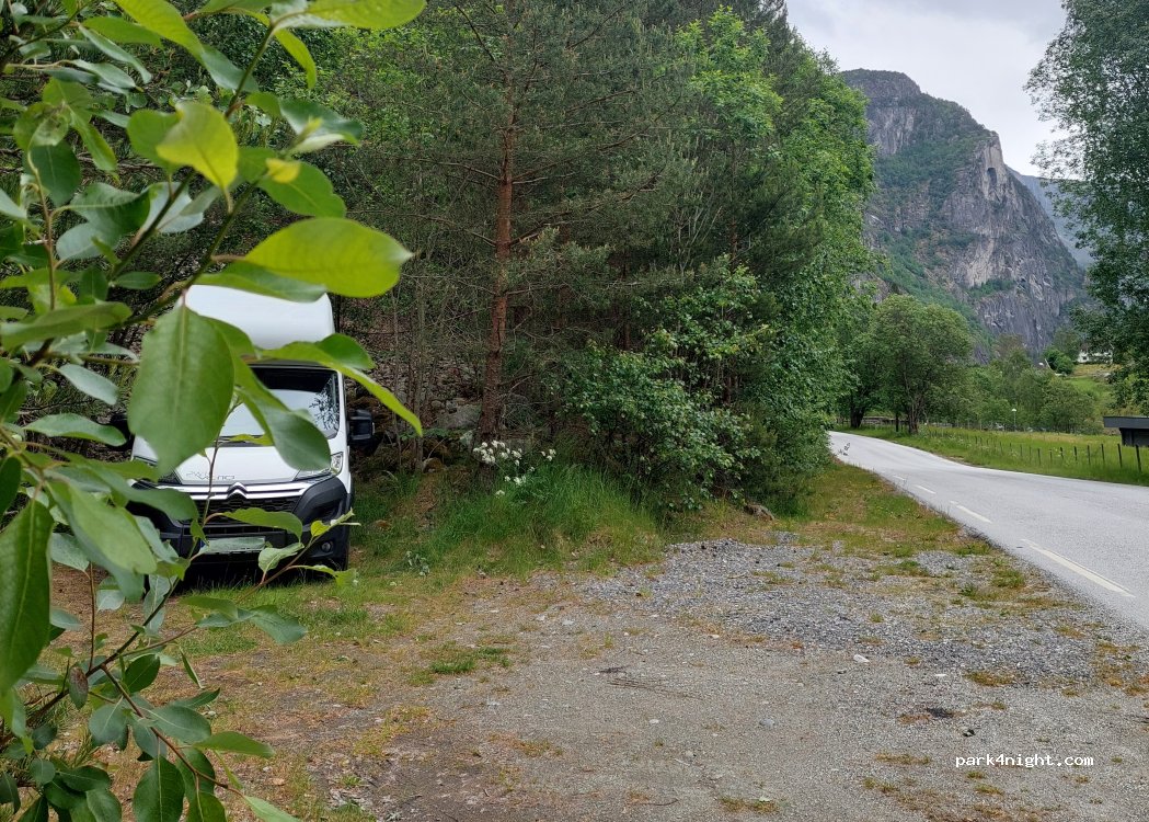 Next to the road under trees, space for one camper or two if friends come along. Tents behind the car are possible.