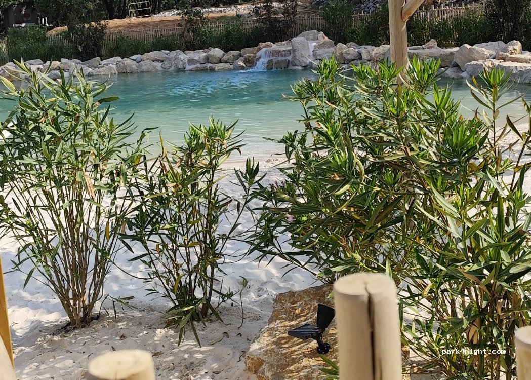 très grand emplacement avec des chênes pour l'ombre. piscine lagon superbe et petit restaurant/bar. idéal pour des vacances au calme