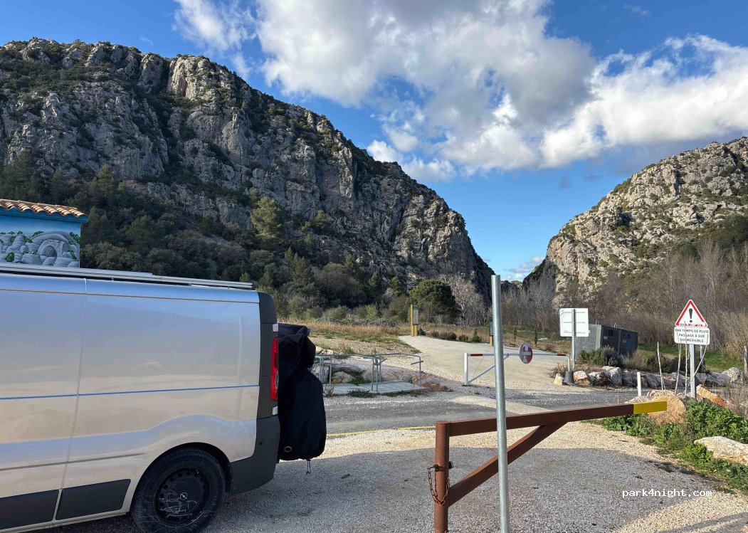 Eh bien pour 5 € le parking la nuit jusqu à 9h00 que des cigales pour faire du bruit Le cadre est sympa la baignade à 5 minutes dans une eau claire et bonne biensur trop de mon de en journée à mon goût Mais beau cadre