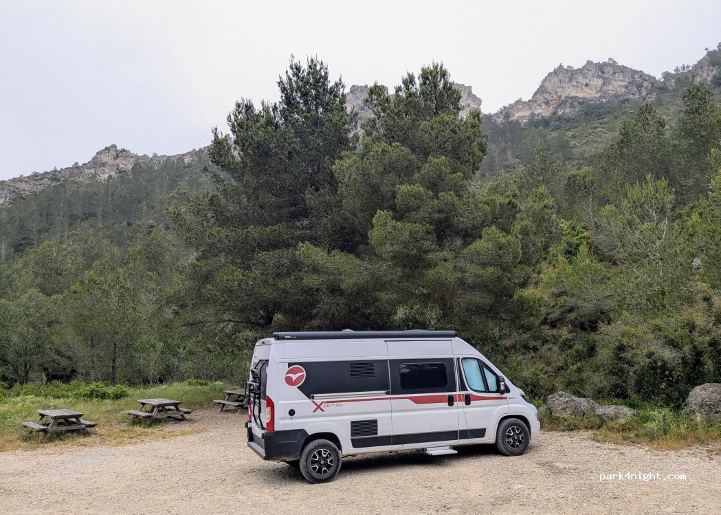 Parking isolé avec tables de pique-nique au bout d'une piste de 6km. Splendide étape au milieu de la nature, calme garanti ! Départ de rando pour aller découvrir les peintures rupestres et les grottes des environs.