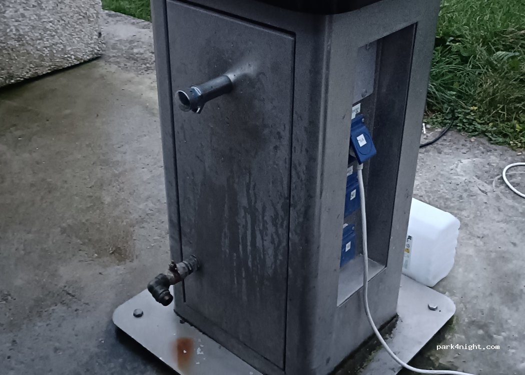Aire de service complète hors wc fonctionnelle avec électricité sur PC domestique , prévoir grande rallonge afin de s’écarter de la zone de vidange. L’électricité est mise à disposition du fait de la grande production solaire par panneaux sommaire sur les portiques ombragés pour le stationnement des véhicules du parking attenant du centre aquatique. Merci à la commune pour ces services gratuits.