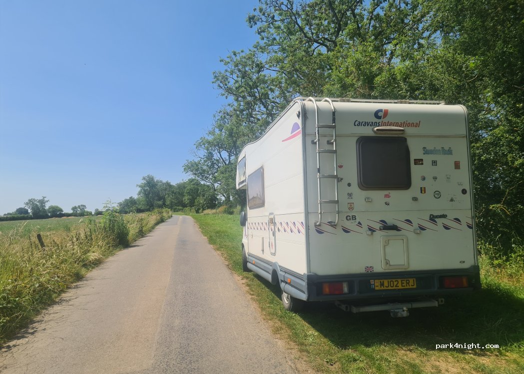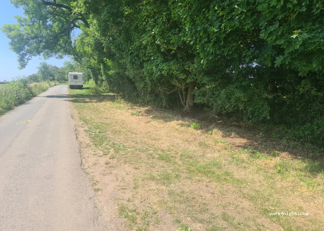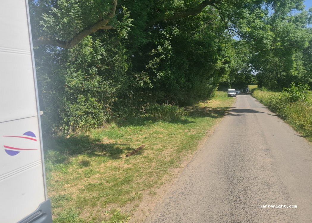 Grass lay by, flat and wide, road not busy. can walk to Foxton locks nearby where there are also toilets (upper car park) and fresh water. Elsan point at bottom car park. both car parks allow 15 mins free. This spot is nearby so can fill up/empty, then park here. Best avoided in winter/heavy rain as will get very muddy, but perfect in summer. pub and shop at Foxton and locks, also short walk to pub at Gumley.