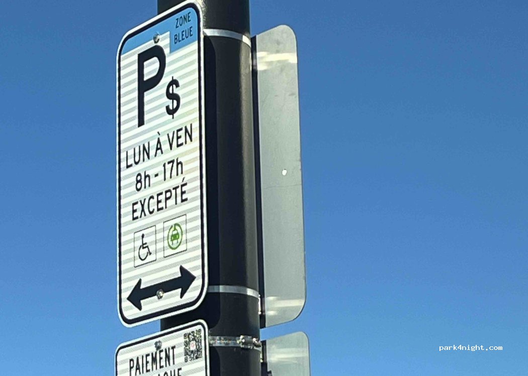 Pas trouvé le panneau pour 3 jours gratuits mais ce stationnement est payant seulement de 8h à 17h du lundi au vendredi excepté les jours fériés. Donc, on peut se stationner pour la soirée et dormir jusqu’à 8h. Il y a des toilettes publiques et la piste cyclable Le P’tit Train du Nord est à côté.