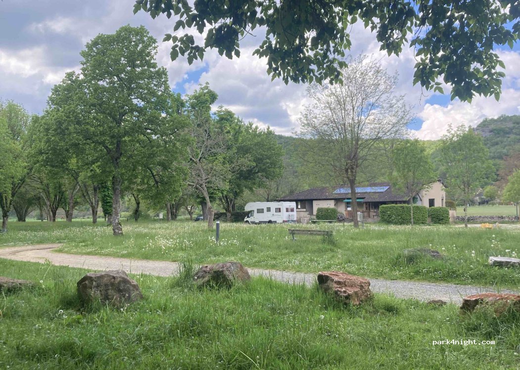 Aire de détente dans la vallée du Célé. Ancien emplacement du camping municipal. Ombragé près de la rivière, avec départs de canoës, mise à l'eau en autonomie. En haute saison, marché gourmand le jeudi soir. Excellent pain à la boulangerie et épicerie du village, à 100 mètres.