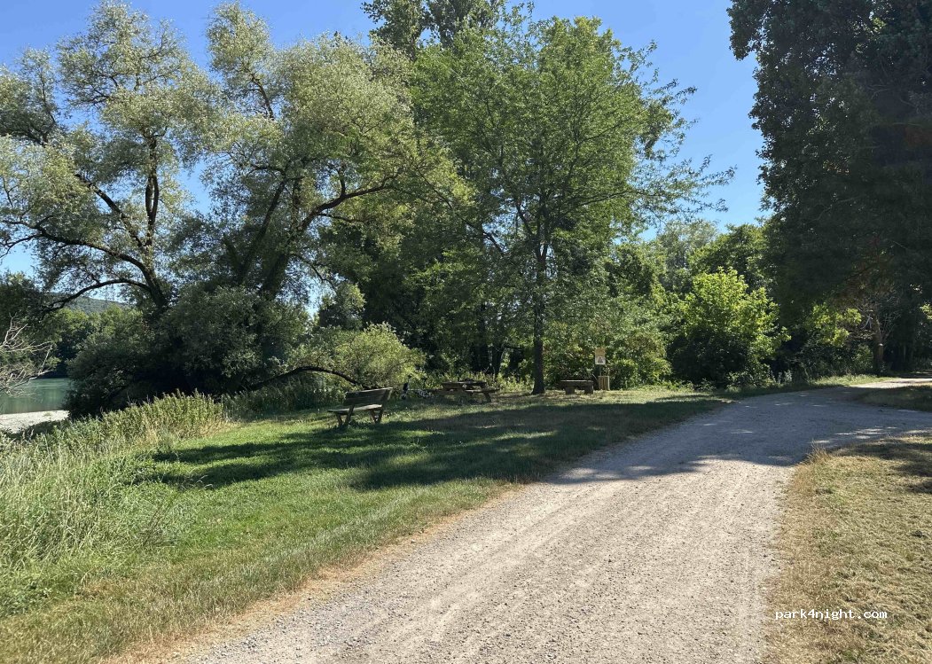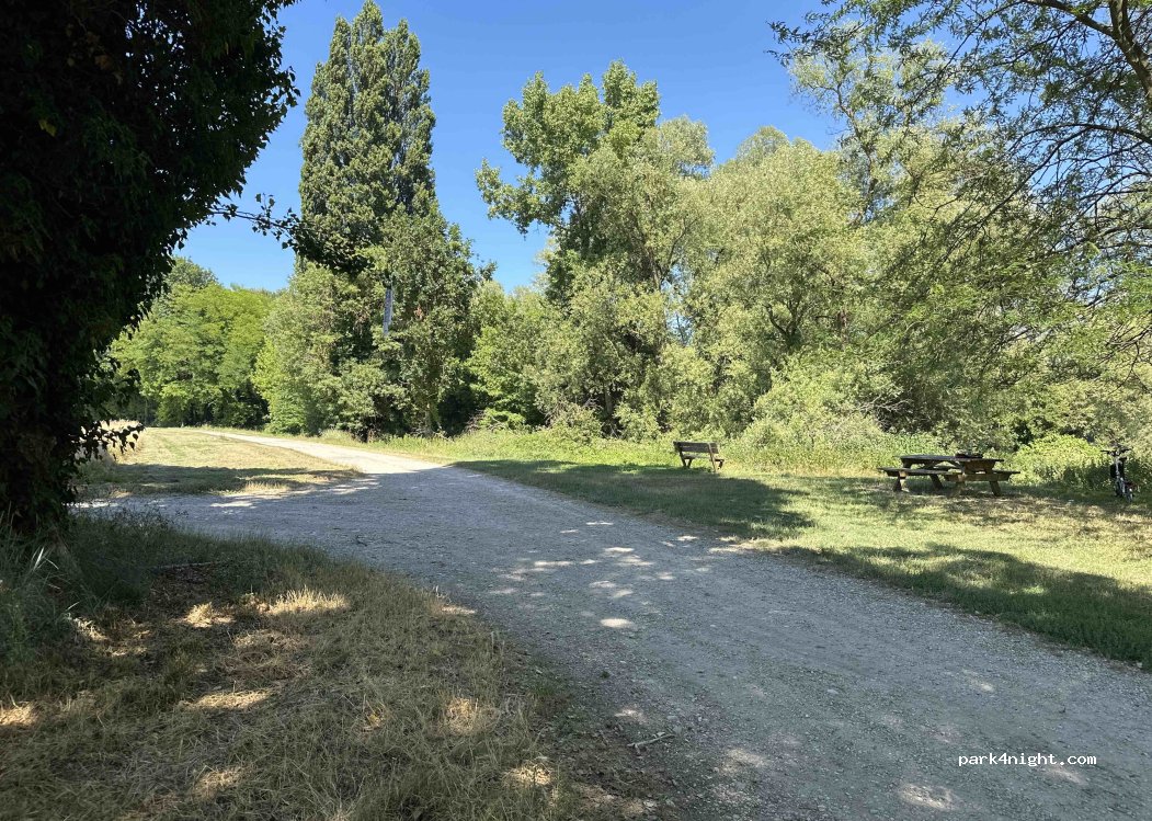 Ubicación tranquila, cerca del agua. Mesa de picnic y banco. Acceso por camino de tierra a 300 m. Posibilidad de dar la vuelta a autocaravanas normales. Posibilidad de aparcar un rato.