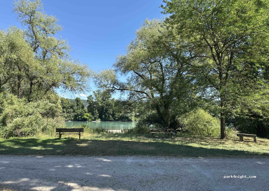 Quiet location, near the water. Picnic table and bench. Access via dirt road 300m. Turnaround possible for normal campervans. Possibility to park for a while.