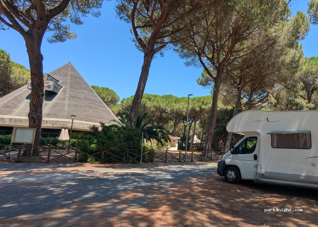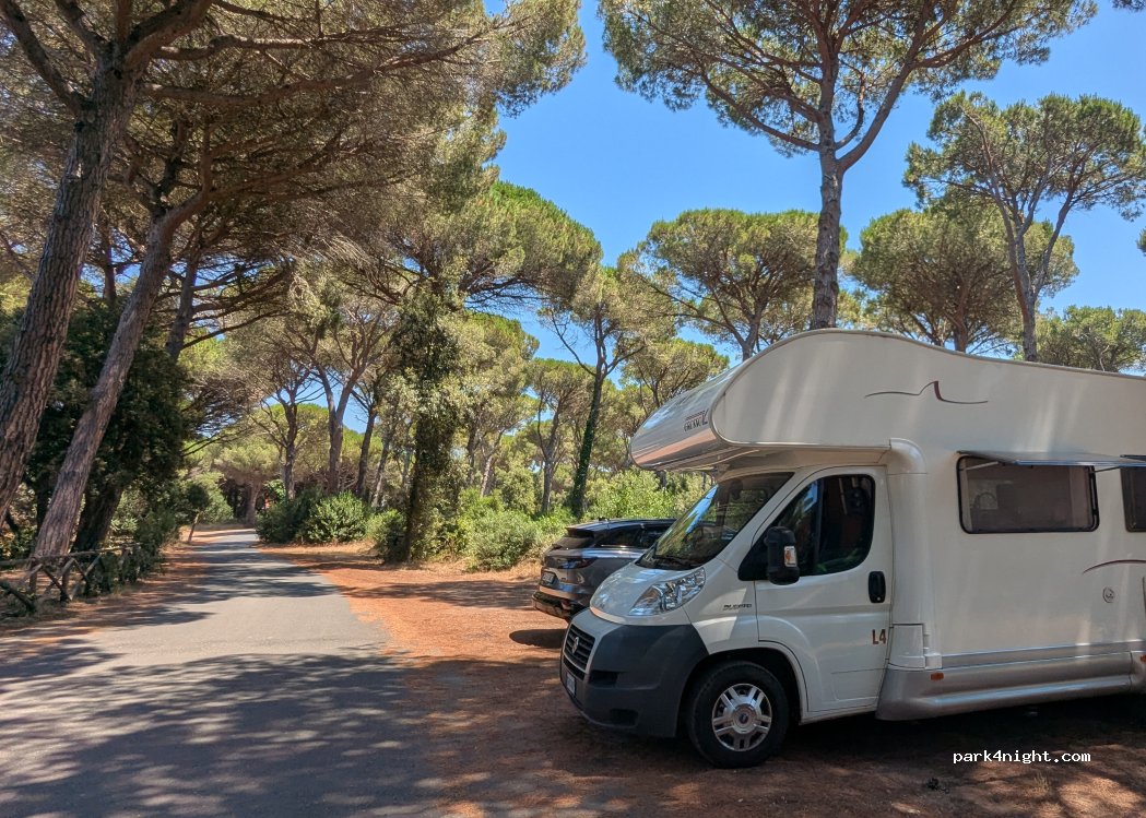 Parking très calme, à l'ombre de la pinède, tout près du parc d'attractions Cavallino Matto, on entend les cris de ceux qui montent sur les manèges mais il ferme à 18h30 donc ce n'est pas gênant