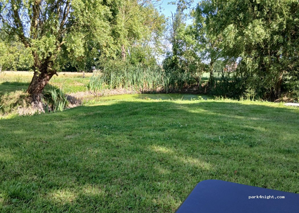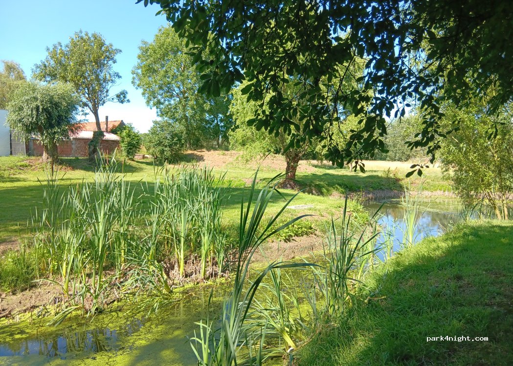 Vous pouvez vous installer où vous voulez sur la pelouse près de l'étang ou du bâtiment. Le long de la route, vous trouverez un parking avec des barriques, d'où vous pourrez apercevoir l'étang. Pour vous installer sur la pelouse derrière l'étang, remontez le petit chemin entre l'étang et le pâturage du fermier.