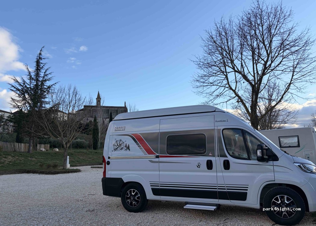 Très belle aire toute neuve. Aire très bien située. Elle est à 5 minutes des commerces et du village médiévale. Tous les services disponibles. Aire à recommander