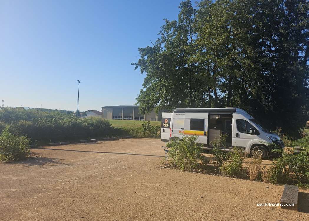Parkplatz mit rund zwanzig Stellplätzen in ruhiger Lage. Der Parkplatz liegt neben einem Fußballplatz und entlang des Wander- und Radweges „La Traverse“. Ideal für eine ruhige Übernachtung.