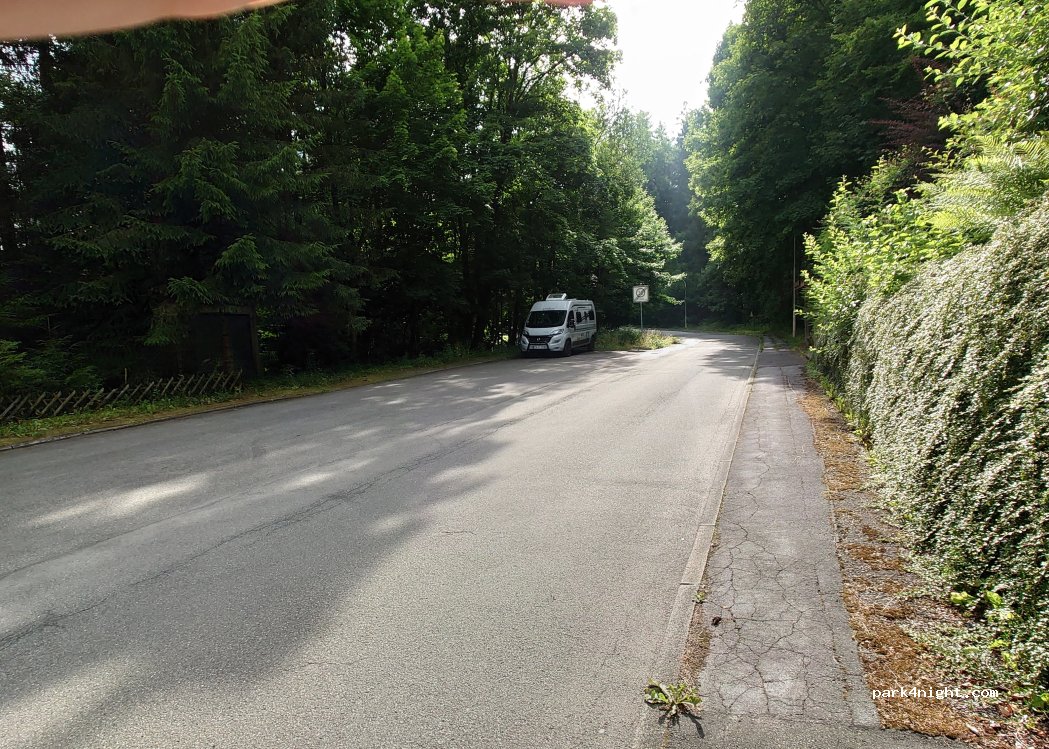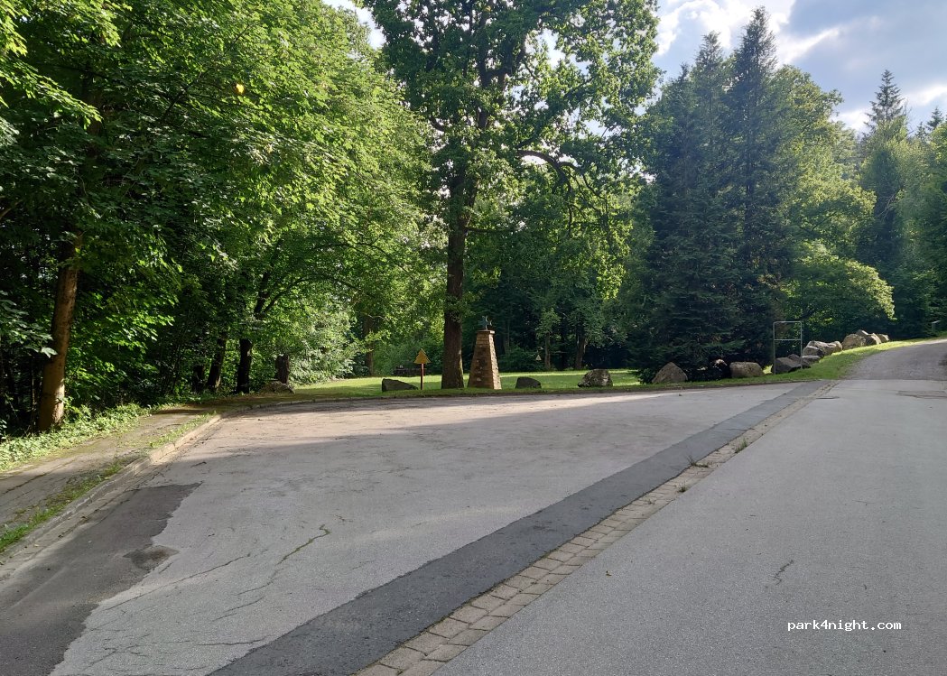 Un parking très calme au bout d'une impasse. Selon l'orientation, il peut accueillir au moins six véhicules. Un bon point de départ pour des randonnées en montagne. 50 mètres plus loin se trouve un plateau avec un monument et une vue sur la vallée de Wildemann. Aucun panneau d'interdiction, aucune nuisance. Le véhicule est garé ici à l'ombre des arbres. Pas d'hébergement disponible, seulement un emplacement pour une ou deux nuits.
