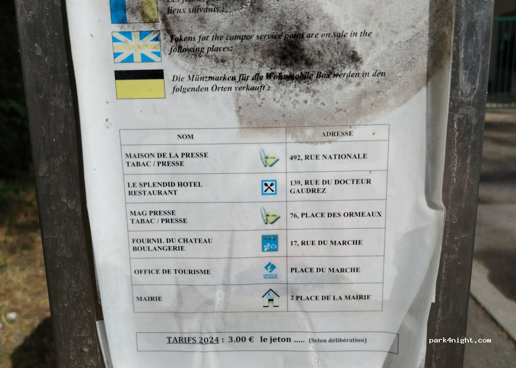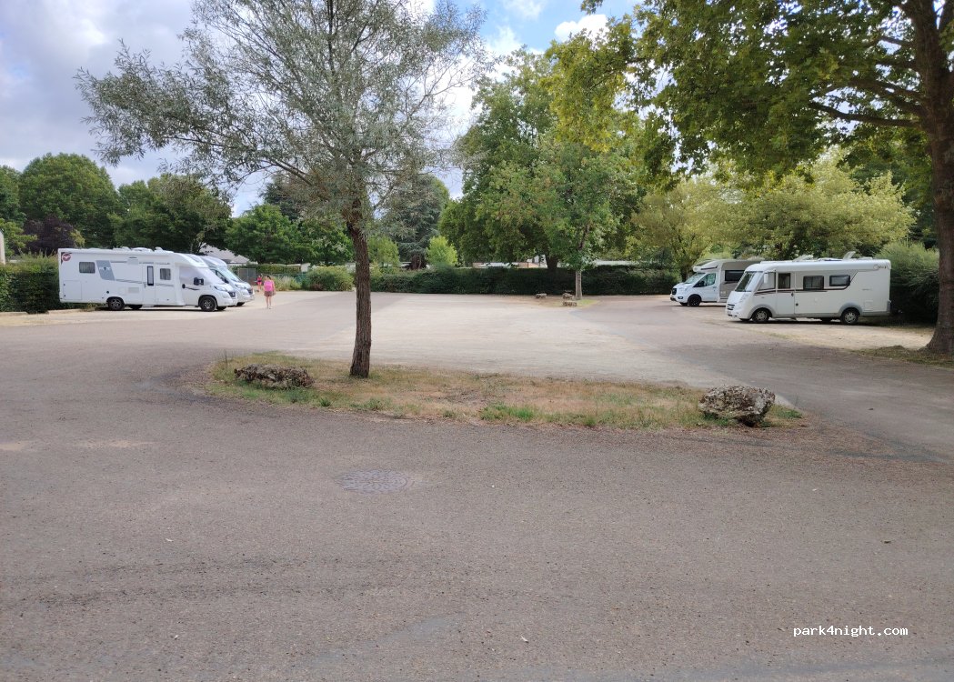 Postos com sombra, nivelados, todos os serviços funcionando neste dia água gratuita, rio com mesas a 200mts . Fica a 10 minutos a pé do chateau, passamos 3 noites muito tranquilas