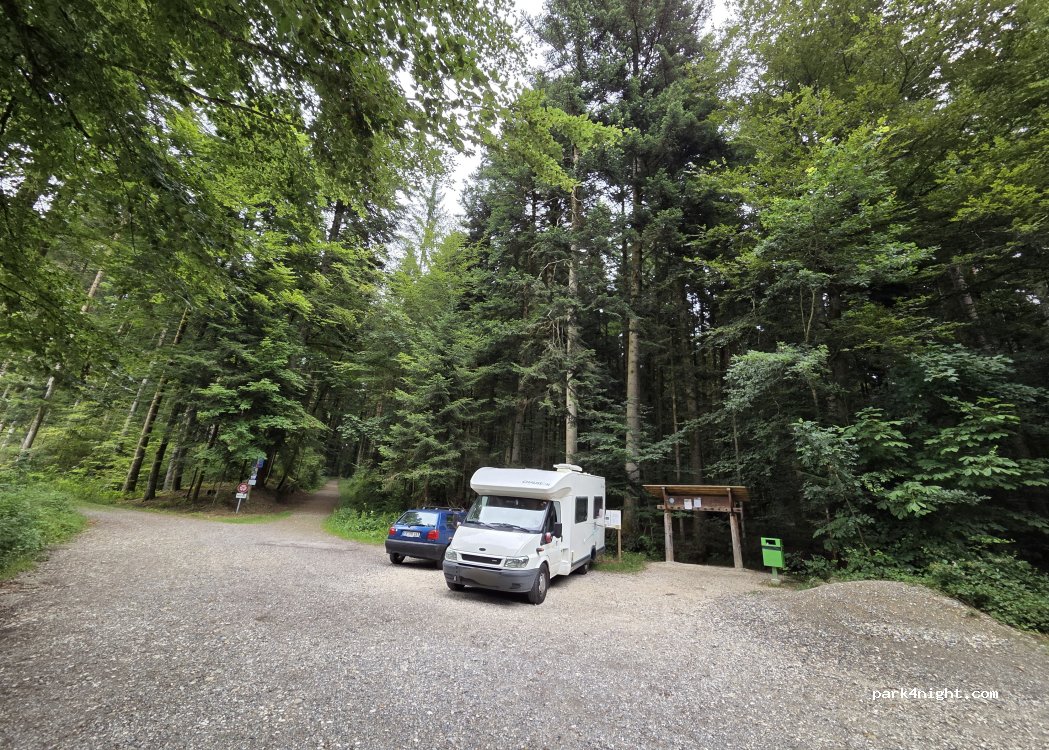 Ein kleiner, ruhiger Parkplatz im Wald. Vielleicht zum Übernachten geeignet, auf jeden Fall aber für eine Pause oder einen Waldspaziergang.