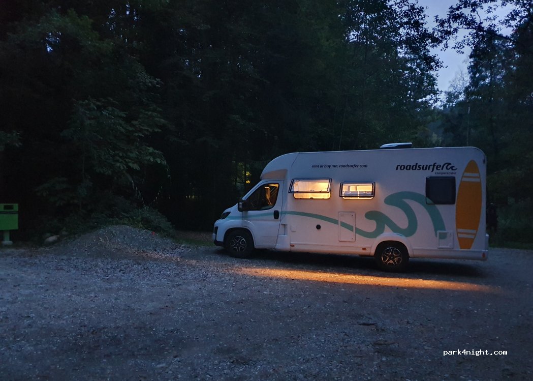 Wanderparkplatz nicht weit von der Autobahn entfernt. Sind gegen 18 Uhr an einem Freitag angekommen. Noch wenige PKW von Spaziergängern dort, die um 20 Uhr alle weg waren. Recht ebener Untergrund. Gelegentlicher Autoverkehr auf der nebenliegenden Landstraße. Insgesamt super, um auf der Durchreise zu nächtigen.