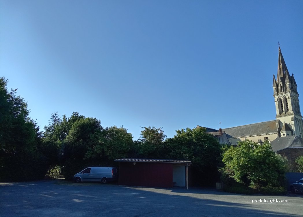Parking gratuit jour/nuit, goudronné, plat, calme, derrière une boulangerie. Toilettes gratuites, robinet et poubelle.