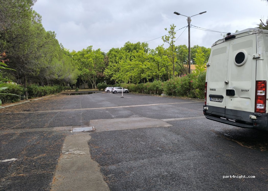 Gran parking de asfalto a las afueras de la ciudad. Rodeado de árboles, vacío y muy tranquilo por las noches. Pernoctación sin problema.