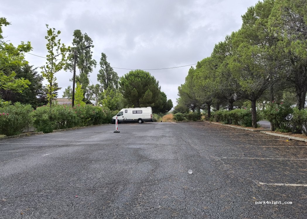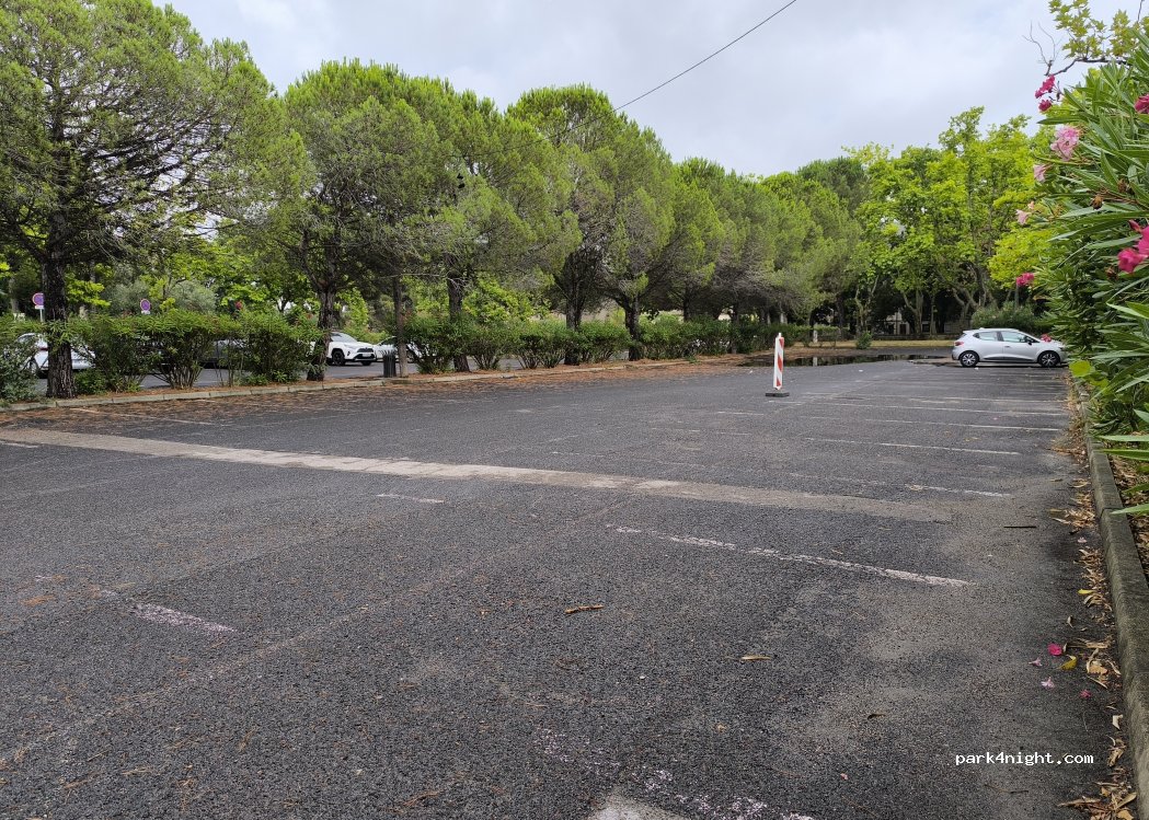 Grand parking asphalté en périphérie de la ville. Entouré d'arbres, vide et très calme la nuit. Le stationnement de nuit est facile.