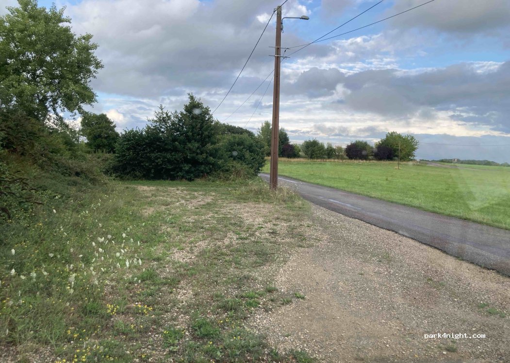 Petit parking au bord d’une route de campagne peu fréquentée , face à des champs. Bien plat et vue dégagée.