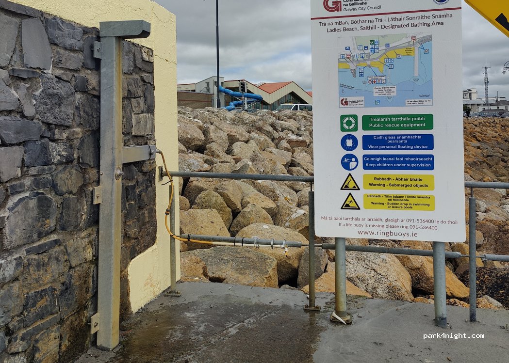 Des douches extérieures froides et des robinets d'eau sont disponibles sur la plage. Un parking est disponible dans la rue principale.