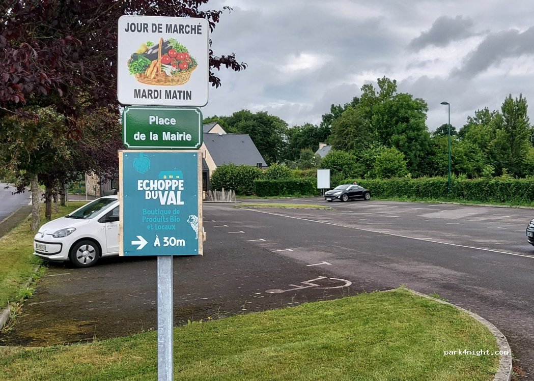 Vaste parking pour se garer. Relativement calme (rue assez passante toutefois) mais à privilégier pour une pause en journée car la nuit la cloche de l’Eglise sonne toutes les 1/2h... L’éclairage public s’éteint à 23h et se rallume vers 6h