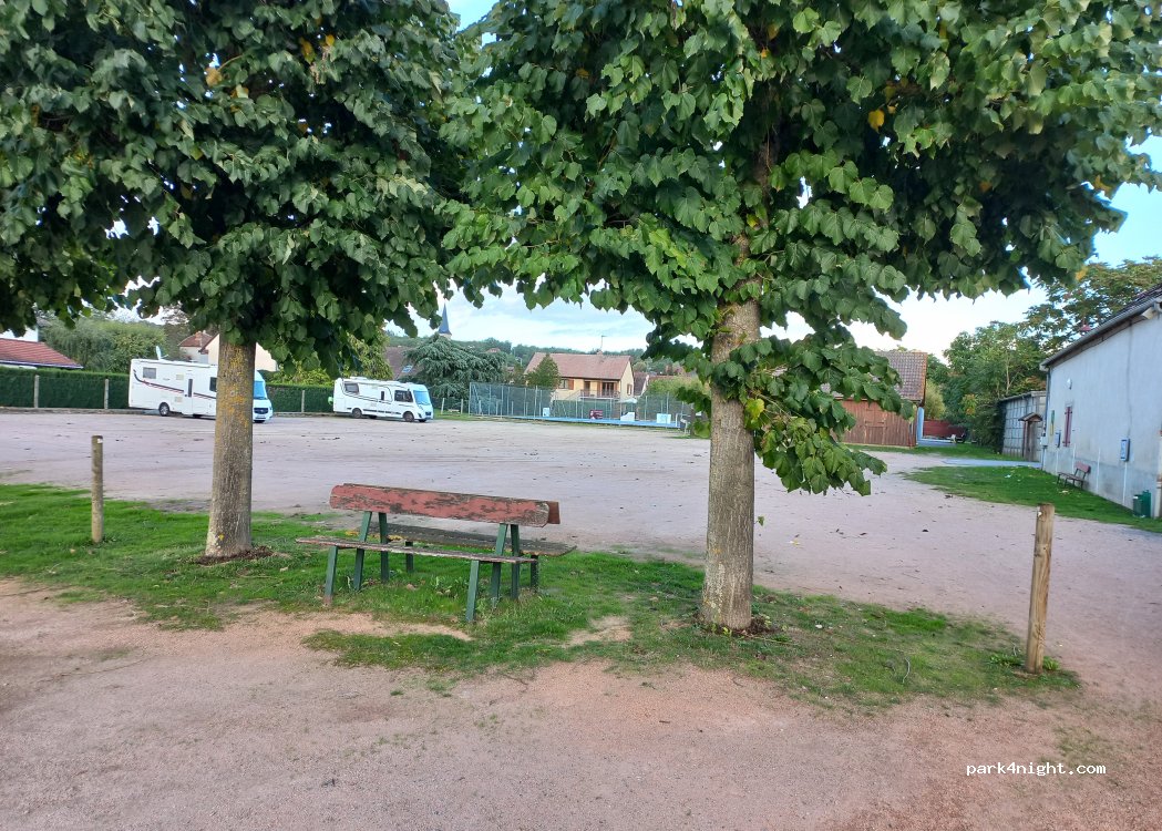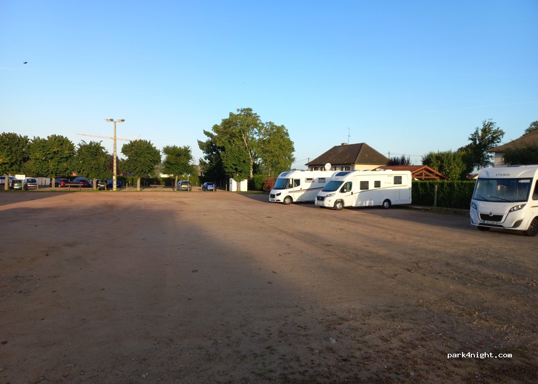 Aire très calme. Beaucoup de places et Sol plat. Stationnement Gratuit ainsi que l’eau propre et les vidanges. Un grand merci a la municipalité. Une épicerie et une boulangerie dans le village.