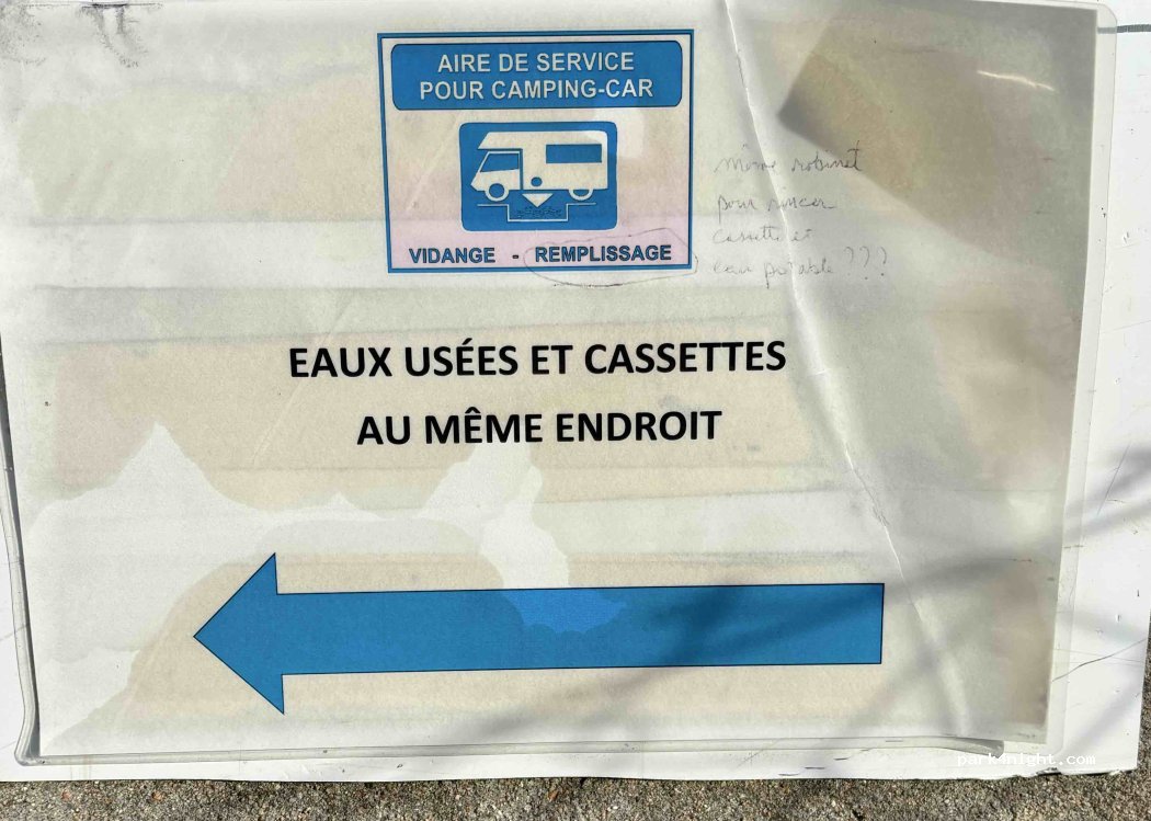 Merci à la municipalité Tout est gratuit, et même si effectivement il faut vider ses eaux noires au même endroit que les eaux grises, c'est très bien. et pour dormir effectivement c'est très bien aussi.
