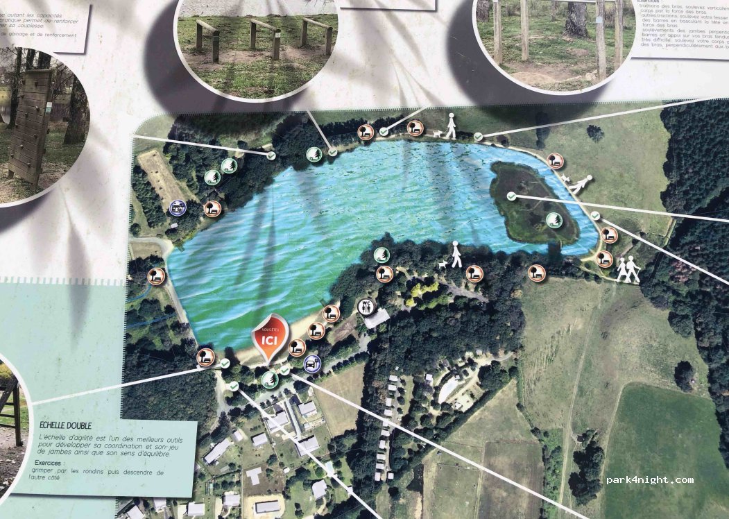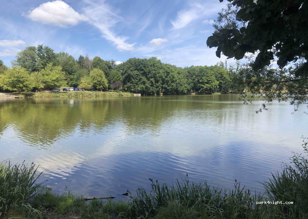 Bonito estanque donde no se permite nadar. Paramos a hacer un picnic. Hay un estupendo parque infantil, dos pistas de petanca con un punto de agua al lado y baños públicos bajo el restaurante al final del lago. Se puede hacer senderismo o ciclismo desde aquí. También parece posible aparcar una autocaravana en el lugar indicado en el mapa de la foto. Consultar.