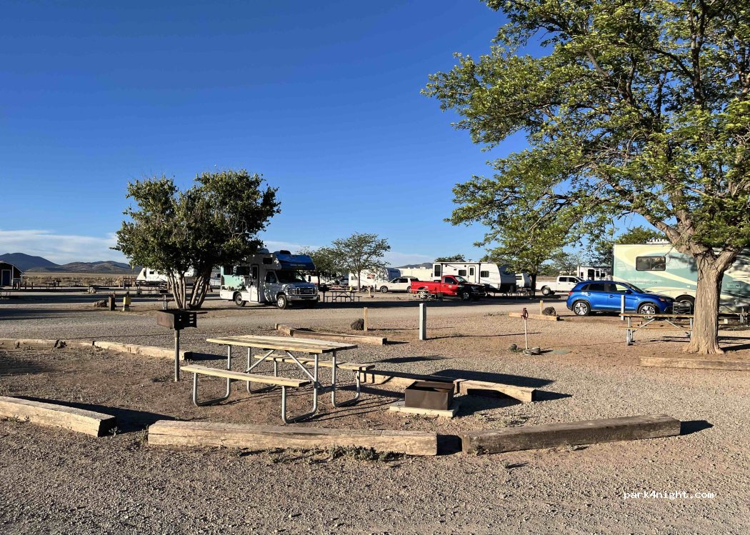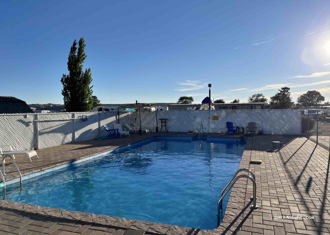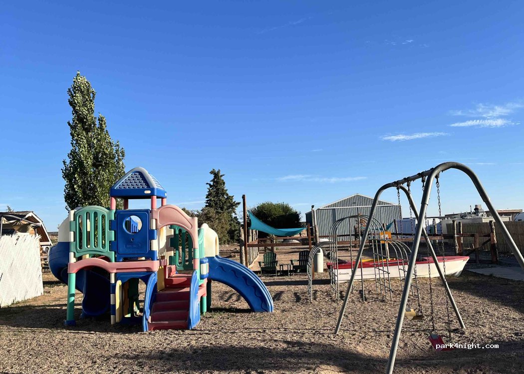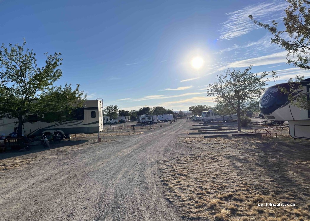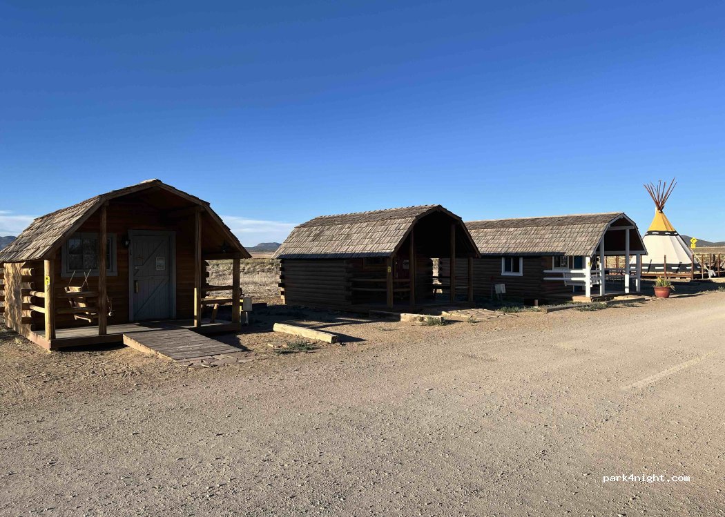 A beautiful and quiet campground on Route 66. The railroad tracks are right next to it, but it didn't bother us. There's a pool. Each site has its own bench and charcoal grill. If these aren't available due to fire hazards, a gas grill is available. If you don't have a camper or tent, you can rent small cabins. There's a playground and a small dog park. Restrooms, showers, and washing machines are available. Electricity, sewage, and fresh water are available right at your site. Friendly staff.