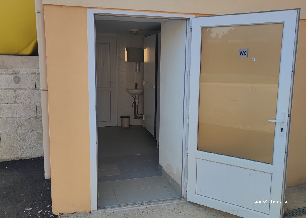 New parking with 2 toilets, 1 sink, boules pitch, picnic table on green land. Quiet place to maintain and respect the cleanliness of the toilets. Behind the town hall. Church nearby. Thank you to the town for this quiet and clean place. 3 km from bakery/grocery store.