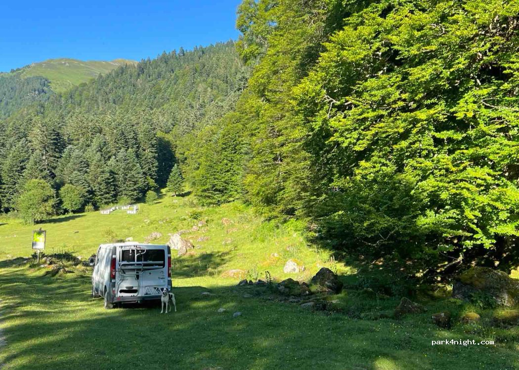Beau spot (pas de service, être autonome) de l'autre côté du pont, au bord du torrent. Départs de randos très jolies à faire (lac bleu de ce côté et lac d'Ourrec côté parking bitumé à côté de la chapelle). Lieu à préserver et respecter, la Nature comme on l'aime !