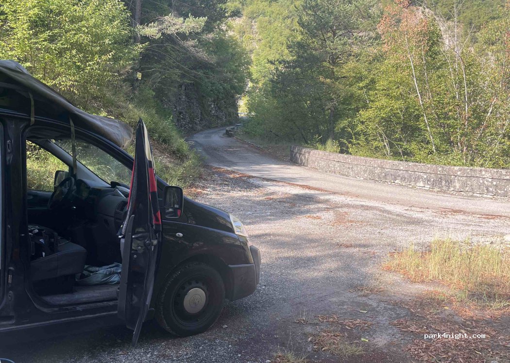 Au bord d’une route peu fréquentée en fin de journée. Il y a de la place pour un van ou un camping car, légèrement pentu.