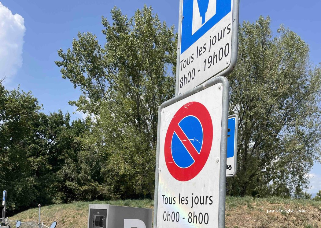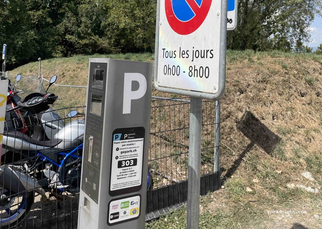 Aparcamiento diurno de pago. No se permite aparcar entre las 00:00 y las 8:00. Hay duchas, baños y vestuarios cerca. Hay una zona de césped con sombra cerca, con una magnífica vista del lago Lemán, ideal para comer o relajarse. Hay barbacoas disponibles.