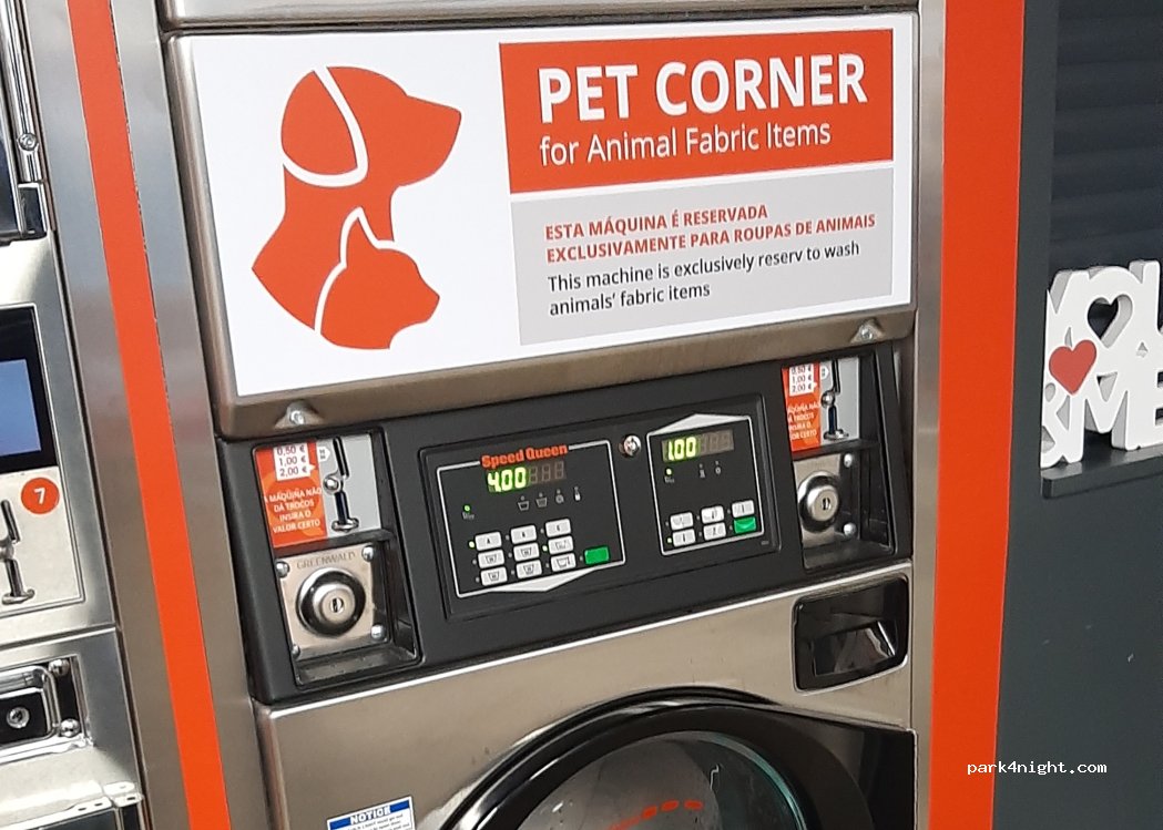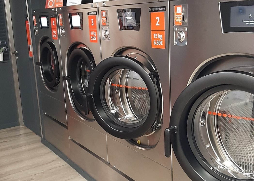 Lavandería Speed Queen, parece nueva, pequeña pero muy acogedora con sofa rojo y sillas, 4 lavadoras y 4 secadoras, más una lavadora y secadora para ropa de animales, no lave ahí, sólo pasé por delante. Tiene T.V. y alguna planta decorativa. Mucho sitio para aparcar en la calle cercana, mirar google maps.