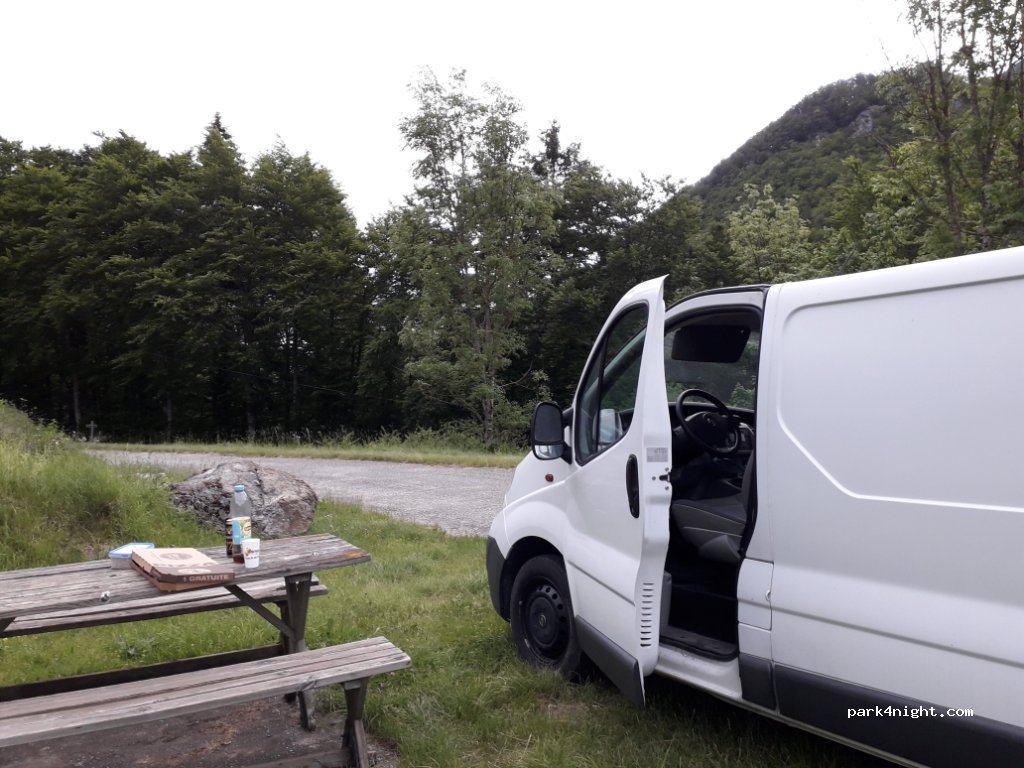 Super vue du parking très au calme. Seul bémol les tas de gravier le long de la route derrière les tables de pique-nique. Nous avons passé une super nuit.